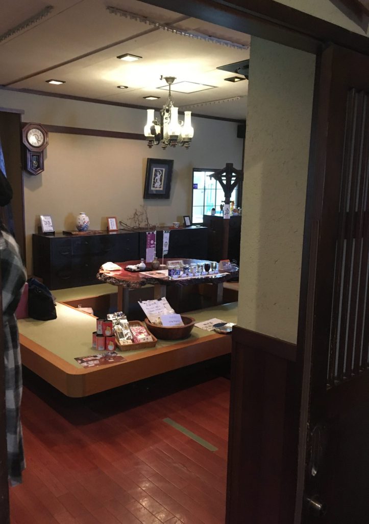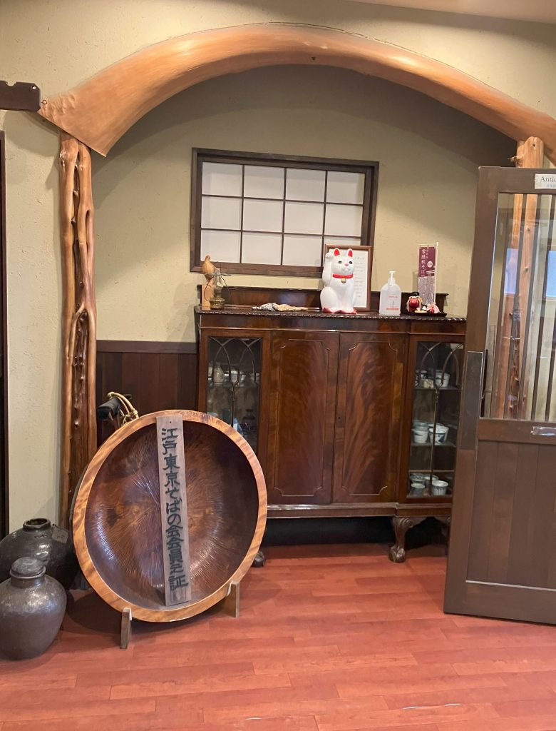 四階建ての貝塚ビルの二階が「手打ちそば処 玄庵」です。蕎麦屋の前身は家具屋とのことで、店内はフローリングで、古民家風のクラシックな和箪笥やシックな天井照明灯などが目を引きます。店内はBGMにジャズが流れ、アンティーク風のテーブル席、テーブルの個室「谷川」、畳敷きに堀こたつ席の和室「妙義」と「淺間」があり、和洋折衷のゆったりした雰囲気の中で食事を楽しむことができます。