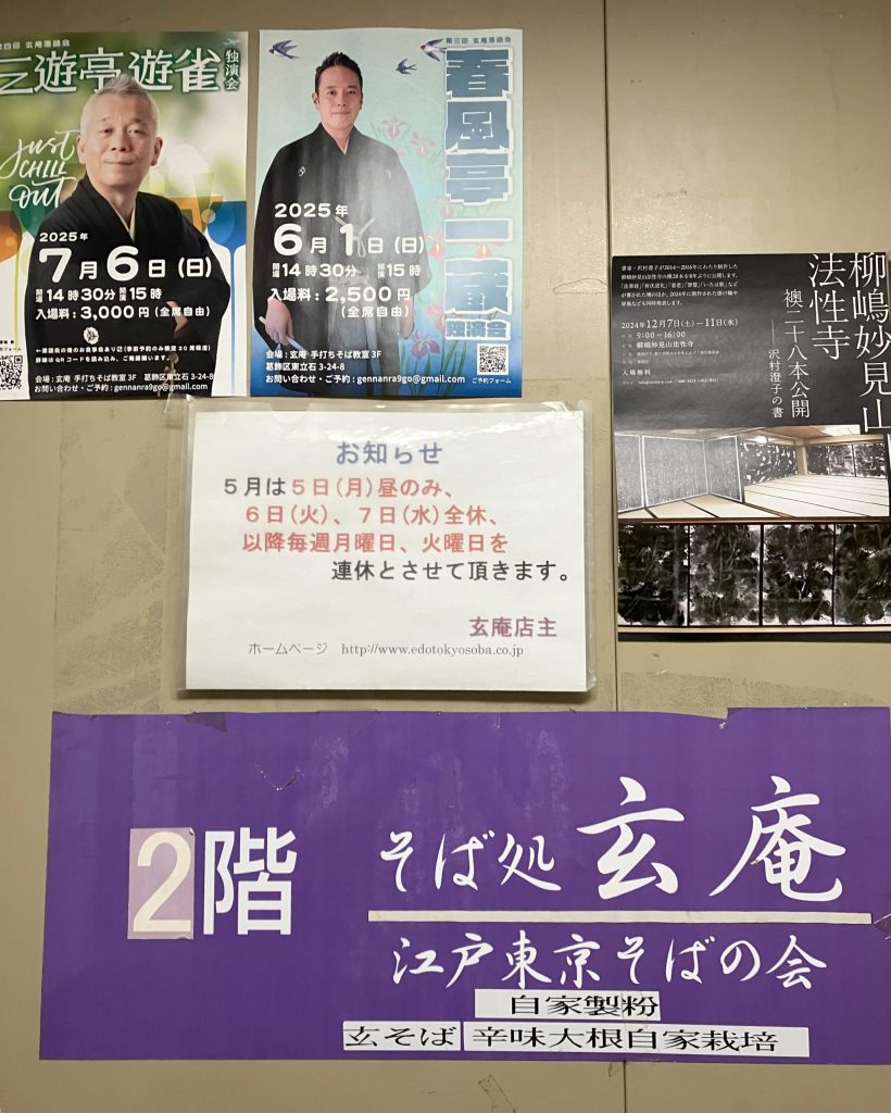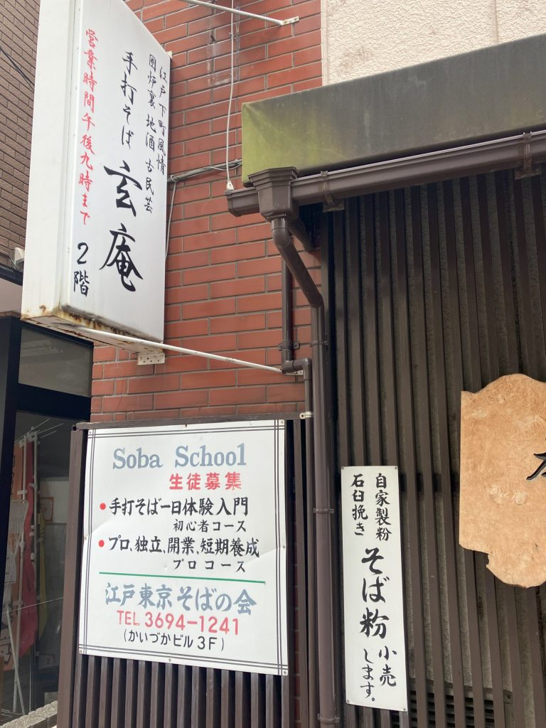 玄庵は「江戸東京そばの会」を主催し、店内に蕎麦打ち教室を併設しています。一般の蕎麦好きを対象とした初心者の一日体験コースと、独立、開業をめざすプロコースがあります。卒業生は全国各地で蕎麦屋さんを開業しているとのこと。レジカウンターには、開業したお弟子さん方の名刺カードが置かれています。私はそれを見て何軒かのお店に行き、どこも美味しかったのを覚えています。テレビのグルメ番組で紹介される、行列のできる繁盛店もあります。