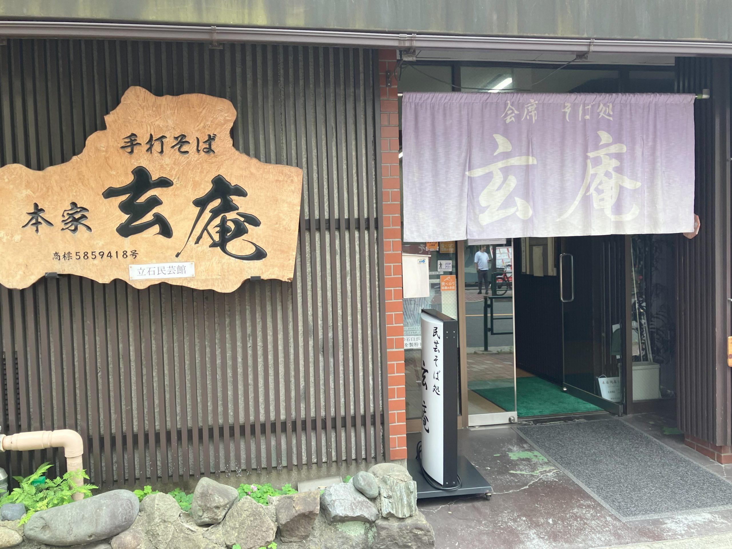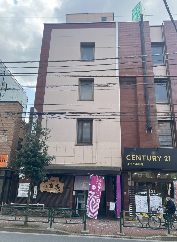 手打ちそば処 玄庵は、奥戸街道沿いにある蕎麦の人気店です。京成立石駅から仲見世通りを抜けゆっくり歩いても約10分で到着。四階建てビル前にある紫の幟が目印です。