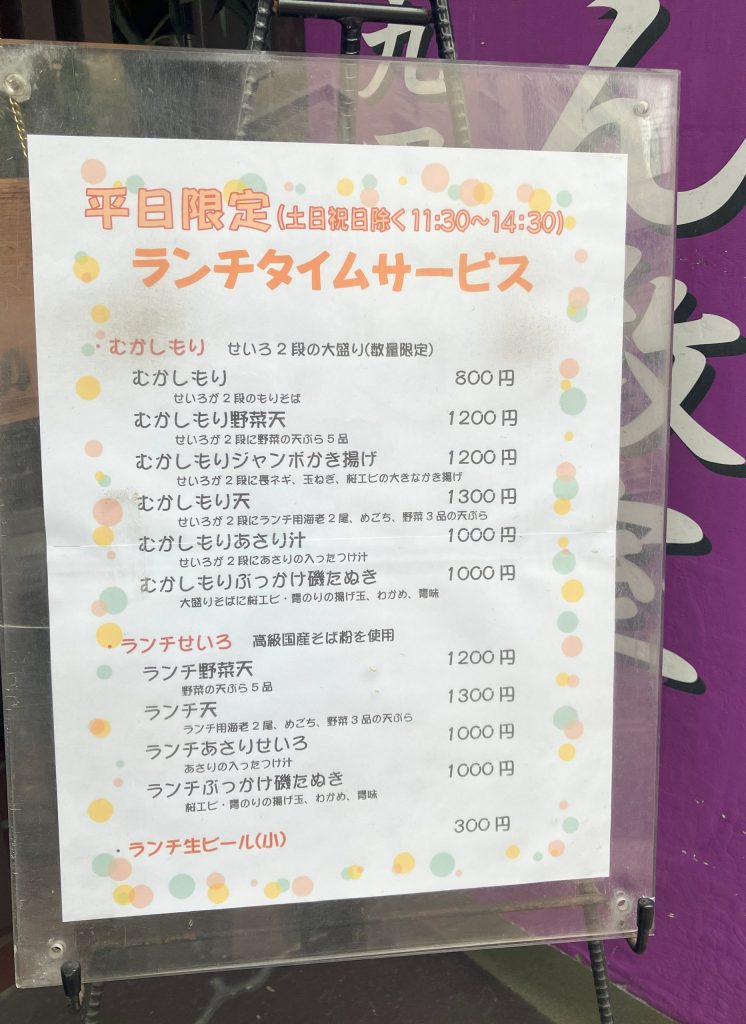 お蕎麦を平日ランチタイムサービスの「むかしもり(もりそば、せいろ2段)」にするなら、税込で800円。「昼呑みセット」とあわせて税込1780円とたいへんリーズナブルです。