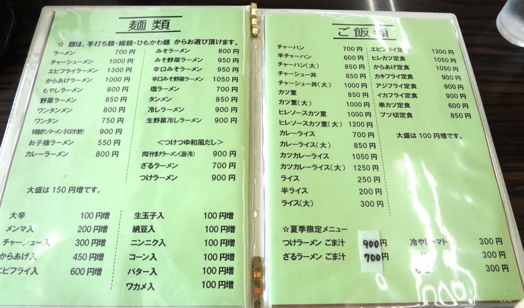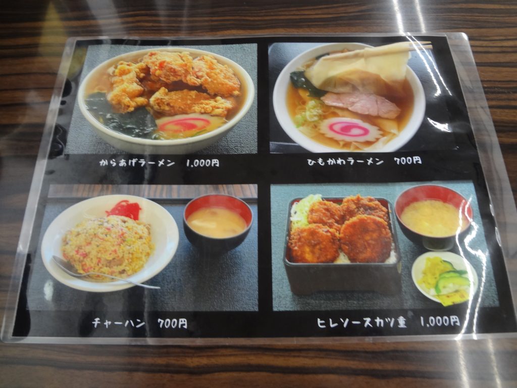 ビールを半分ほど開けた時点でラーメンを注文。麺は手打ち、細、超幅広のひもかわの三種から選べて、どれでも値段は同じ。大盛もプラス100円と格安です。人気メニューは「から揚げラーメン」(¥1000)だそうですが、私はシンプルに「ひもかわラーメン」(¥700)を注文。餃子の皮を広げたような麺の幅は13cmほどだそうですが、麺の食感はモチモチで、あっさりした醤油味とマッチし、たいへん美味しくいただきました。食品の値上りが著しい昨今ながら、献立にあるようにこのお店は大変リーズナブルな気がします。