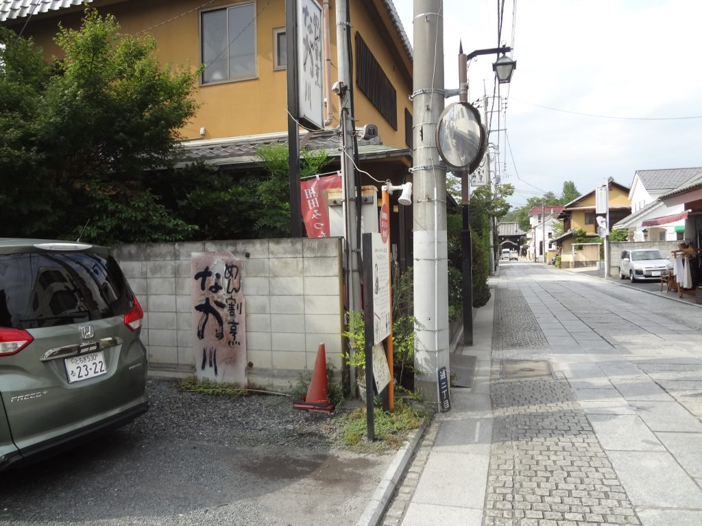 鑁阿寺の南門手前の石畳の大日大門通り(写真)の左側に、「人間だもの」で有名な地元出身の書家・詩人の相田みつを氏縁りのお店があります。昭和20年代、相田みつをの不遇時代、足利市内の高級旅館に作品を持ち込んでも全く理解されなかったなか、作品を購入し飲食の世話もしていたのが「めん割烹 なか川」の前身「旅館 なか川」の女将だそうです。その縁で、店内のあちこちに相田作品が飾られています。相田の好物・甘露煮をつまみに、銘酒と蕎麦を楽しむのが定番とか。