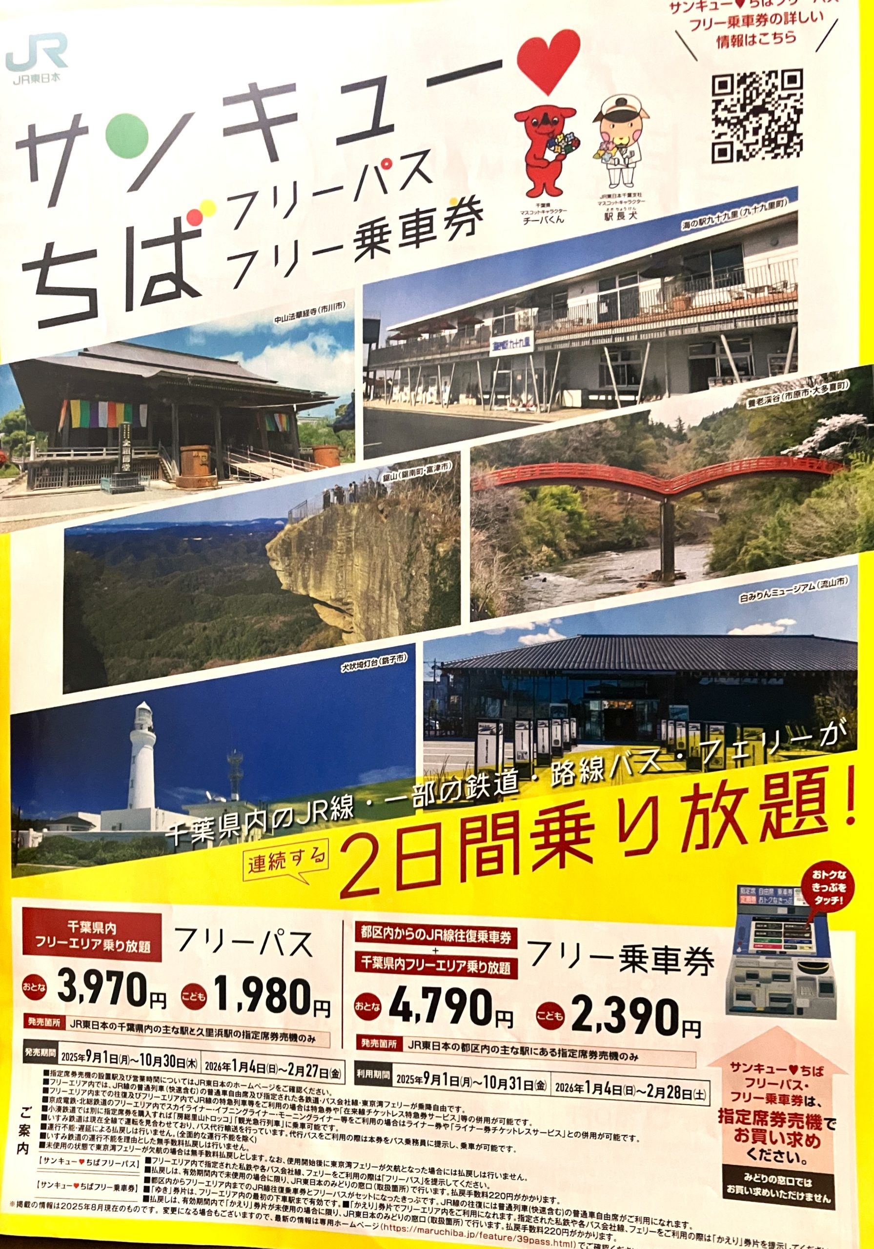 「サンキュー❤ちばフリーパス」は、千葉県内のJR線のほか多くの鉄道・路線バスと東京湾フェリーを、連続する二日間乗り放題になるお得な磁気乗車券です。