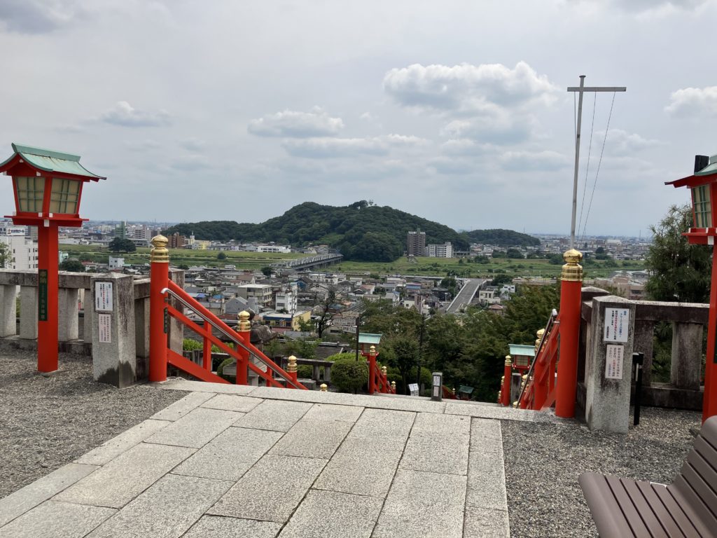 織姫神社について「1,300年の歴史と伝統を誇る機業地足利の守護神が奉られており、産業振興と縁結びの神様として足利市民に広く親しまれています。この神社は、明治12年に建てられましたが、翌13年に火災により焼失してしまいました。その後、昭和9年に社殿再建に着手、3年の歳月をかけて当時では珍しい鉄筋コンクリートで昭和12年、現在の社殿が完成しました。朱塗りのお宮は緑に映え景観が美しく、また境内からは関東平野を一望できます」と紹介しています。確かに眺望もよく、また「縁結びの神様」らしく、何組かカップルの参拝客もいらっしゃいました。