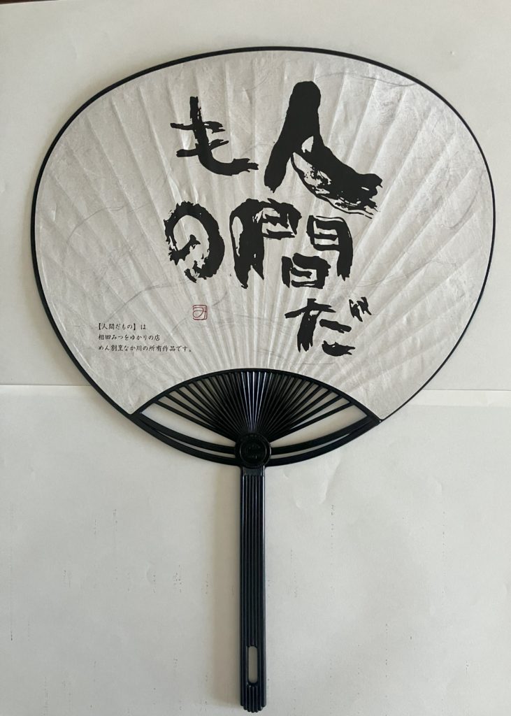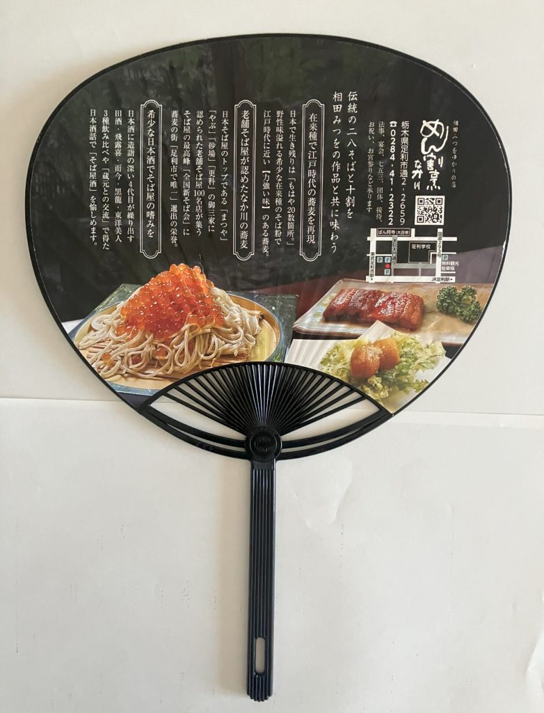 「なか川」では「にしんの甘露煮」をつまみに拘りの日本酒を楽しみ、その後、希少な在来種・三種のお蕎麦(更科・挽きぐるみ・玄挽き)を食べ比べることを推奨しているようです。私が感心したのは日本酒のラインアップです。磯自慢、而今、十四代、飛露喜、田酒をはじめ、入手困難で名前を聞くだけで涎が溢れるような銘柄を豊富に揃えていることでした。しかし残念なことにこの日は買い込んだお酒の在庫があり、当然夕食時にはお酒を呑むつもりなので、酒とつまみはパス! お蕎麦は、お上品な更科を外し、挽きぐるみと玄挽きの二種食べ比べを注文。竹筒を半分に割った器にこじんまり盛られたお蕎麦は、見た目より量があり、色と香り、風味やしっかりした食感を楽しむことができました。食の好みは人それぞれですが、流石お店が自慢げに提供するだけのことはあります。足利再訪ミッションの一つはクリア。いつの日か日本酒コレクションを堪能しに再訪したいと思いつつお店をあとにしました。お店で戴いた団扇は、暑い盛りの街ぶらに重宝しました。