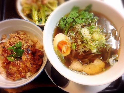 渡良瀬橋橋詰めの北側に「炭火焼鳥 親子丼」の看板を掲げた「よね吉」がありました。お店は階段を上がった二階です。学生さんらしき若者が盛り上がっていましたが、無事入店。早速、喉ぬらしにサッポロビールの赤星大瓶を注文。充実した焼鳥メニューから、まずは定番らしき、おまかせ盛り合わせ5本塩を頼み、その後は特製つくね、ねぎ間、もも、芋芋ののワサビ漬け&セロリの一夜漬け、焼酎、サワーなどなど。勢いに任せて色々食べました。〆にいただいた鶏塩しょうがラーメンも美味しかったです。ご馳走さまでした。