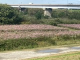 橋の北側には野球やゲートボールなどのスポーツ施設があり、夏には花火の打ち上げ会場として賑わいます。南側は、この時期は色とりどりのコスモスの花が秋らしさを感じさせてくれます。コスモスの見頃はもう暫く続きそうです。